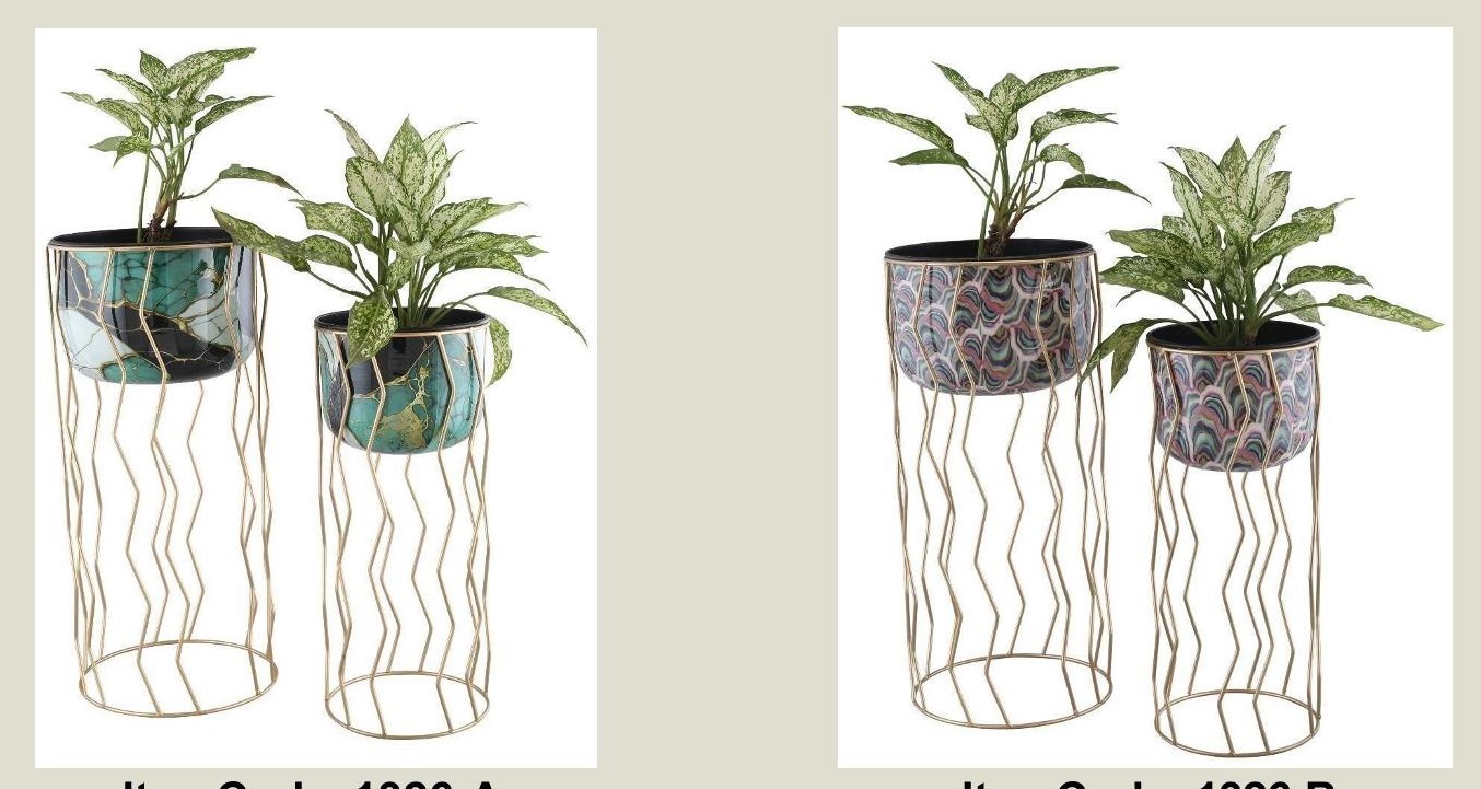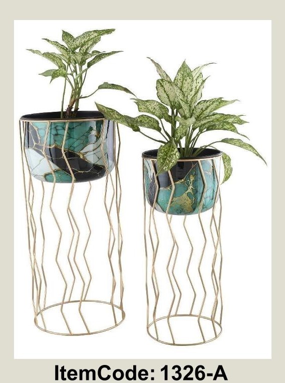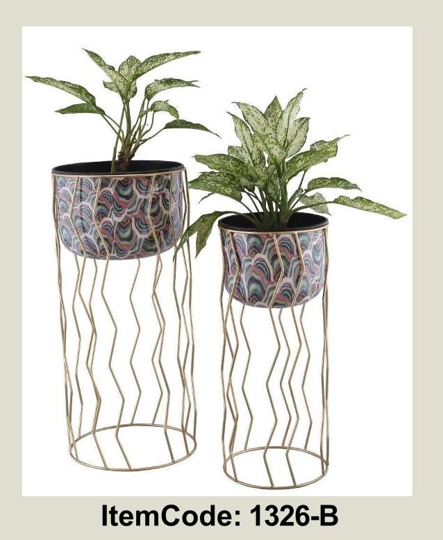 - Plant Container Set of 2 with Meen Pot – Elevate Your Green Corners with Artistic EleganceTransform everyday greenery into a statement of style with our Plant Container Set of 2 with Meen Pot, available in two distinct design codes—1326-A and 1326-B. Each set features two beautifully crafted pots perched atop sculptural gold-toned metal stands, creating a harmonious blend of nature and luxury.Designed for the discerning eye, these containers are more than just plant holders—they’re art pieces that bring depth, color, and personality to any space. Whether placed in a sunlit living room, a cozy balcony, or a curated entryway, they add a touch of sophistication and warmth.
